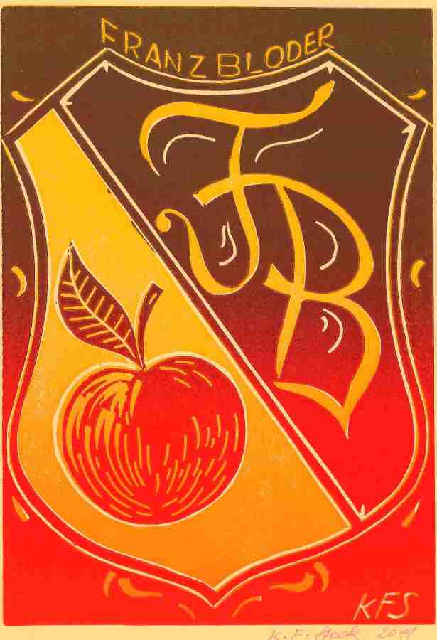 Stock, Karl F.: Monogramm FB - Franz Bloder: Apfelwappen; [Farblinolschnitt] / Karl F. Stock. - 2011-10-05. - [St. Ruprecht a. d. Raab/Wolfgruben], 2011. - (X3/2).