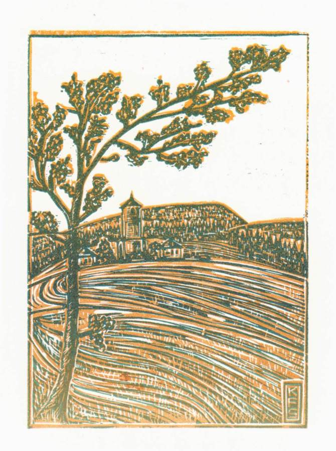 Stock, Karl F.: Schöckl mit Siegerlturm: [Farblinolschnitt] / Karl F. Stock. - 1994-10-28. - St. Ruprecht a. d. Raab / Wolfgruben, 1994. - 210 x 145 mm. (X3/3).