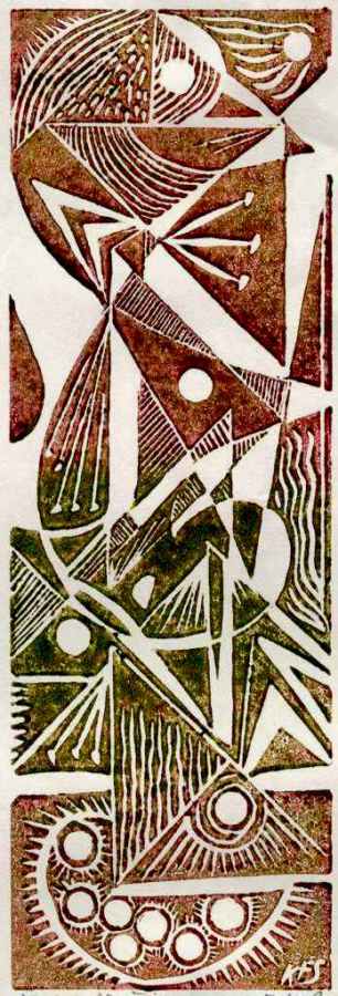 Ornis = Vogel (abstrakte Komposition); 1993-05 als Farblinolschnitt in mehreren Varianten ausgeführt, 2015 als Nachschnitt neu gedruckt. Originaldruck verkäuflich in unterschiedlichen Varianten verfügbar (kfstock@aon.at).